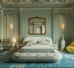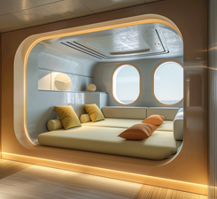 The outside of the ship uses smooth, modern shapes with natural materials like stone, wood, and glass. Colors are soft and neutral to connect with the sea and sky. Spaces are open and comfortable, with a focus on relaxing areas. Inside, the design uses warm Mediterranean colors like terracotta, white, green, and blue. Furniture is simple and elegant, with rich wood and luxury materials. The style is clean but detailed, creating a private and peaceful atmosphere. Modern technology is added to improve comfort and entertainment.