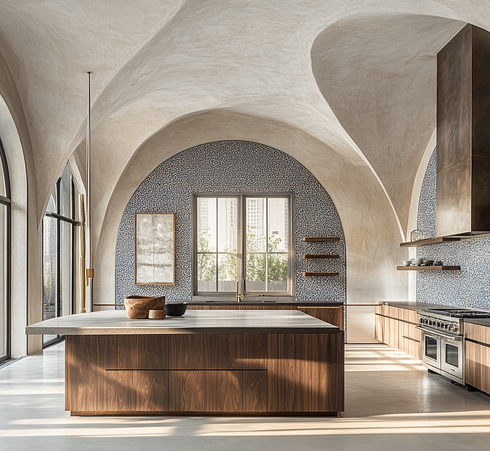 This visionary kitchen design merges the raw elegance of modern industrial style with the intricate artistry of Turkish decorative traditions. At the heart of the space lies a robust concrete island, subtly softened with brass accents that offer both contrast and warmth. The countertops, cut from rich black granite, ground the kitchen in solid sophistication. Surrounding the space, dark wood cabinetry features meticulously engraved Ottoman floral patterns, providing a sense of historical depth and visual poetry. This craftsmanship is elegantly paired with a blue and white mosaic tile backsplash, adding a delicate rhythm and a cool Mediterranean freshness that brightens the tonal palette. Overhead, hammered metal pendant lights cast a warm, textural glow, introducing a hand-forged artistry that contrasts beautifully with the space’s sharp geometry. Above the counters, blackened steel open shelving adds a functional, architectural edge, framing the kitchen with linear simplicity and curated openness. The overall composition is one of thoughtful tension: between old and new, ornate and minimal, matte and gleam. This kitchen becomes more than a workspace it is a culinary atelier, where the soul of Anatolia meets the clarity of contemporary design.