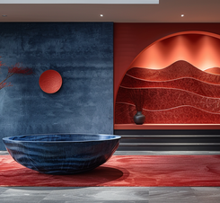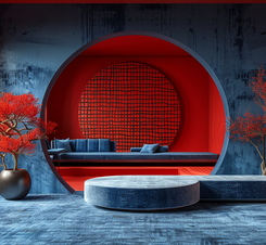 The concept plays with the dynamic tension between vibrant red surfaces charged with emotional energy and navy blue sculptural forms that provide a Zen-like stillness. Clean, sharp silhouettes and minimal textures enhance the surreal quality, while the interplay of soft lighting and deep shadows activates the spatial narrative. This balance creates an atmosphere that feels both luxurious and restrained, pushing the boundaries of experiential retail design.