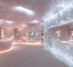 Inspired by : The monumental serenity of ice caves, the elegance of high fashion, immersive storytelling, and modern art gallery spatiality